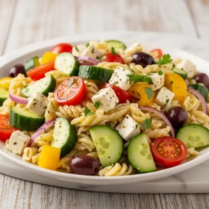 serve chilled or at room temperature alongside a chilled glass of assyrtiko or a crisp Sauvignon Blanc to mirror the crispness of the cucumber and tang of the feta. This approach transforms the Fresh Greek Pasta Salad with Cucumber & Feta Flair from a simple meal to a festive centerpiece.