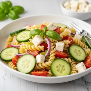 Fresh Greek Pasta Salad with Cucumber & Feta Flair
