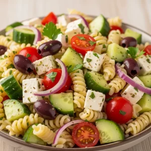 - Combine ingredients: In a large bowl, gently toss the cooled pasta with cucumber, tomatoes, red onion, olives, and feta cheese. Pour the dressing over the salad and toss once more to coat everything evenly.